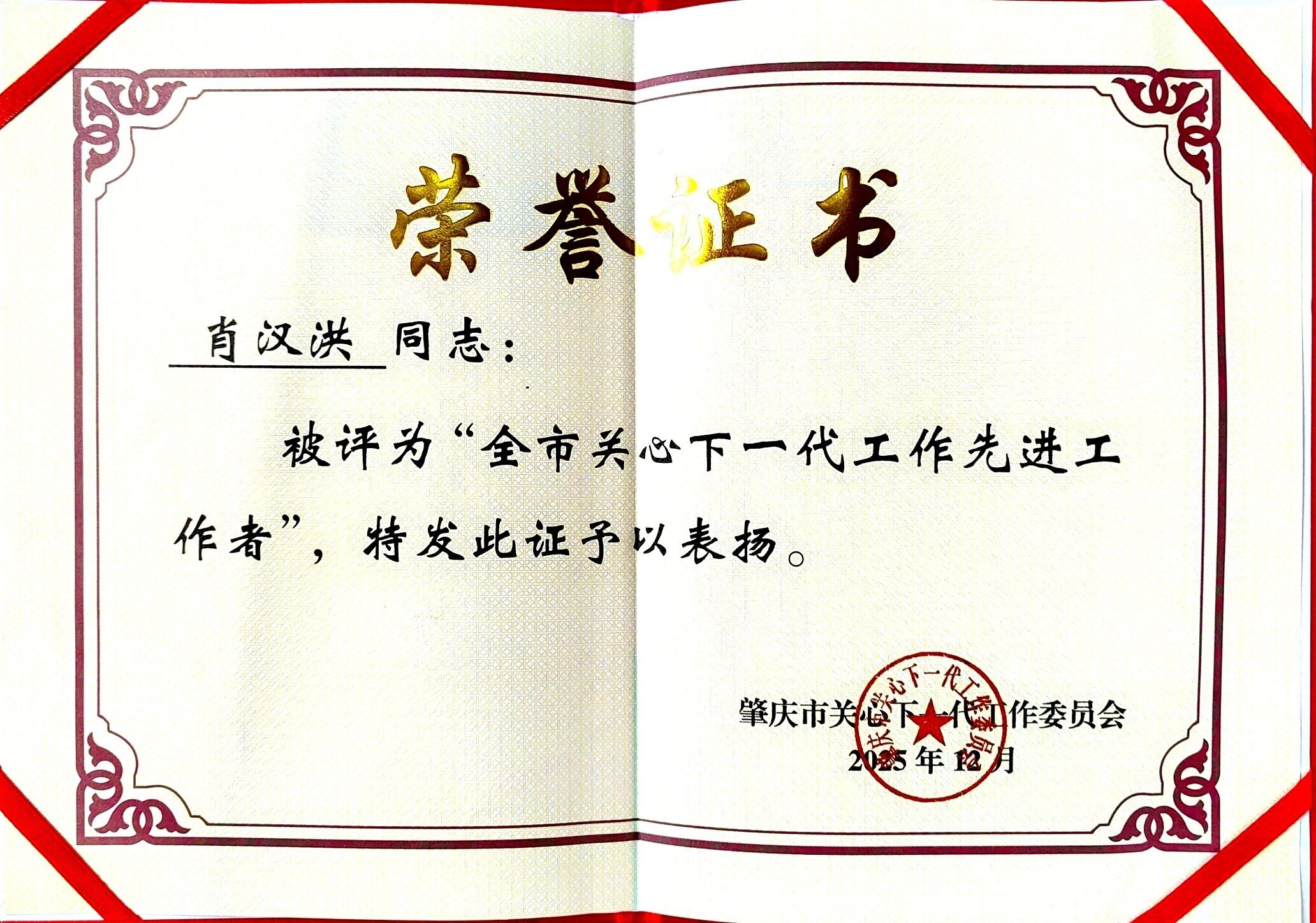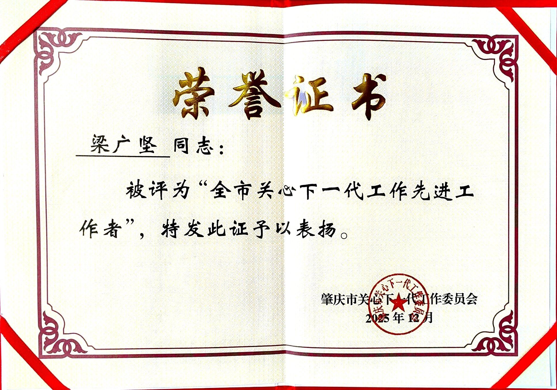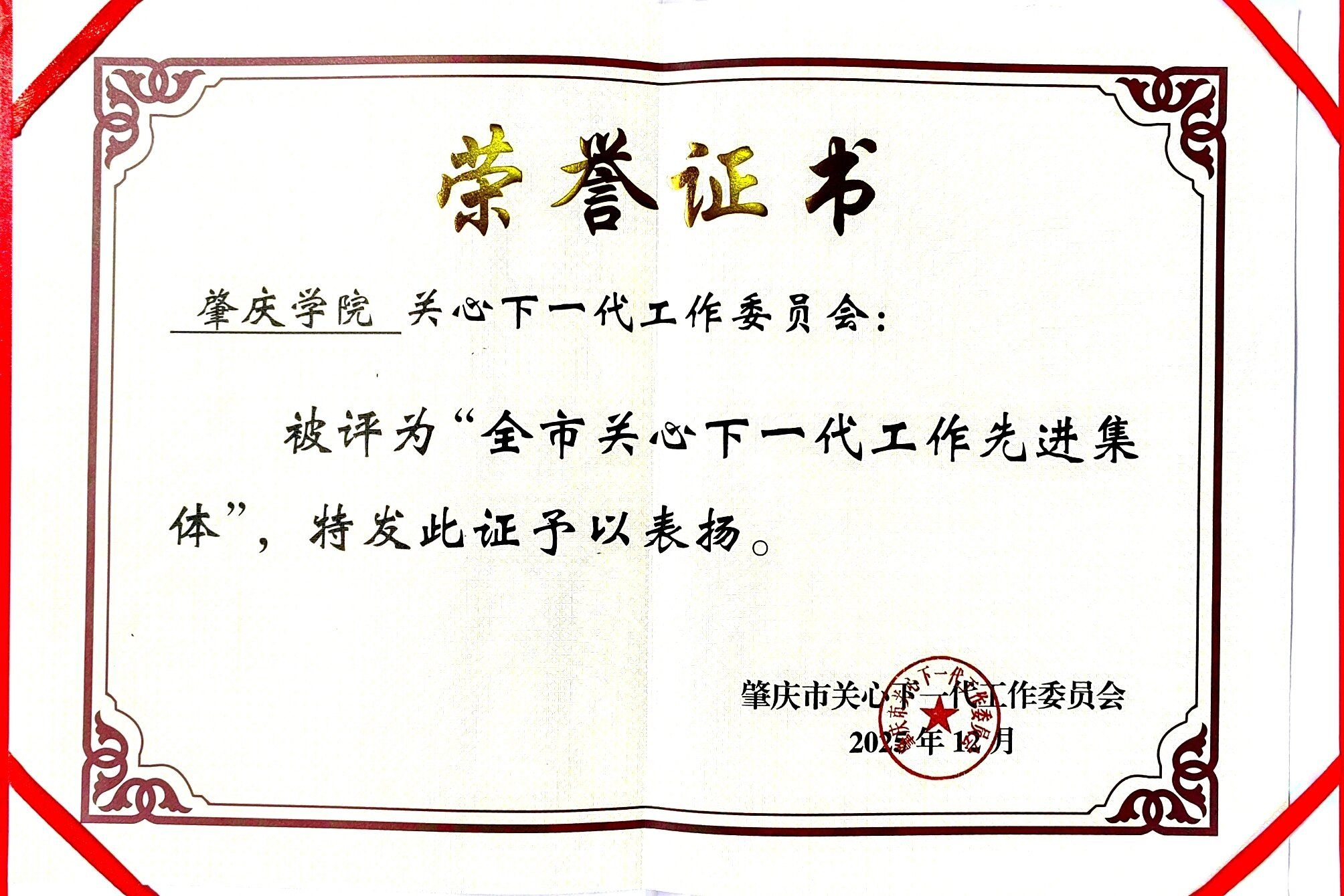 本网讯 近日,在纪念肇庆市关工委成立25周年先进评选中,肇庆学院关心下一代工作委员会获评“全市关心下一代工作先进集体”,梁广坚、肖汉洪两位同志荣获“全市关心下一代工作先进工作者”称号。